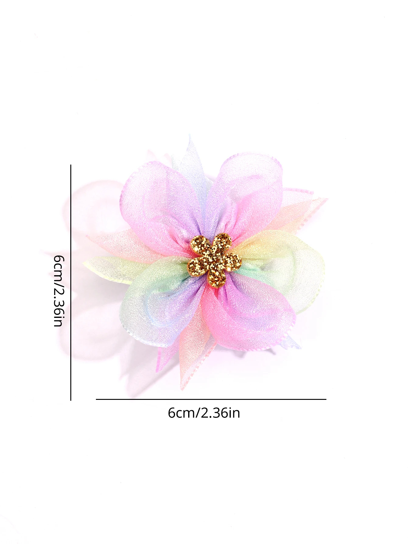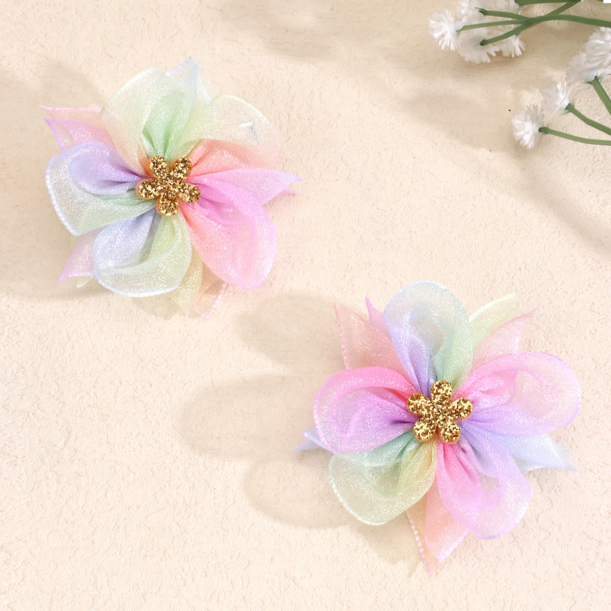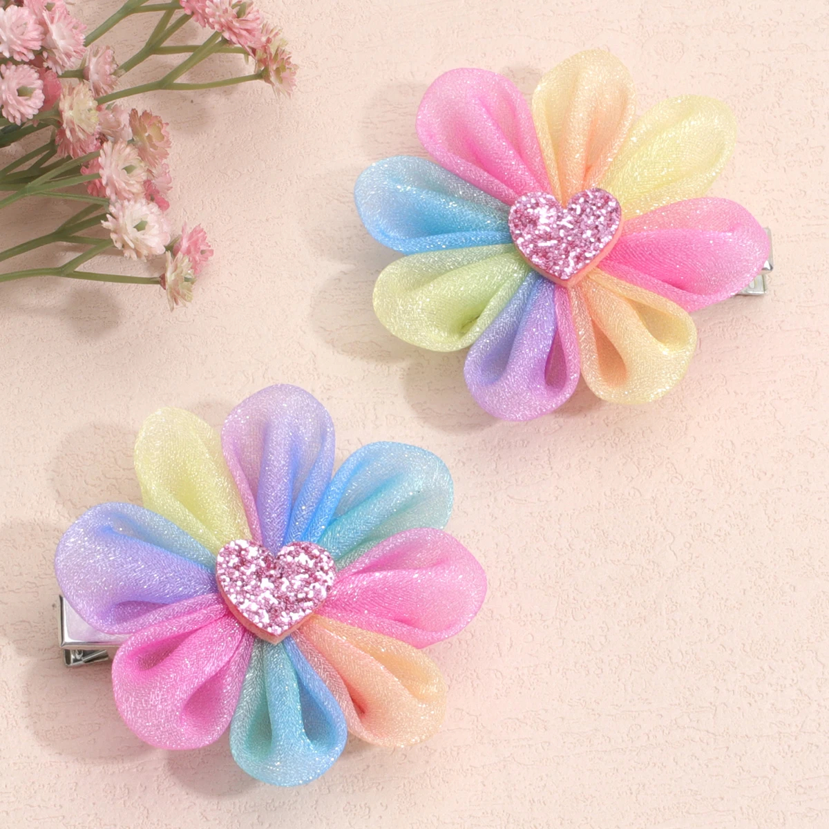 مجموعة مكونة من قطعتين من مشابك الشعر المزينة بزهور قوس قزح الترترية 🌈🌸، مثالية للفتيات الصغيرات لإضفاء لمسة لطيفة وملونة على إطلالتهن.
